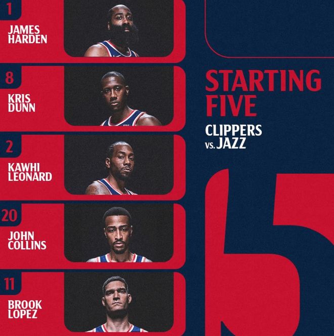 首发阵容方面,快船队这边,祖巴茨、比尔缺阵,保罗继续未随队,泰伦卢教练排出的最新首发五人组为:詹姆斯-哈登、克里斯-邓恩、科怀-伦纳德、约翰-科林斯、大洛佩兹;爵士队队这边,马尔卡宁、凯斯勒、努尔基奇缺阵,首发阵容则为:科利尔、森萨博、米哈伊柳克、亨德里克斯、菲利。