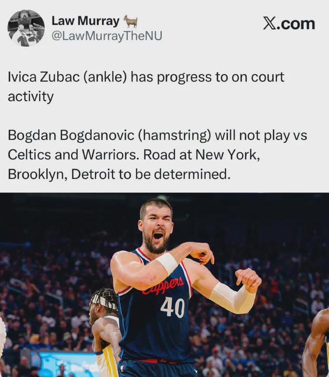 但有一个应该是坏消息,祖巴茨(场均15.6分11.1板2.5助1帽)已经恢复场上训练,而快船的六连胜是在他受伤休战期间打出来的。