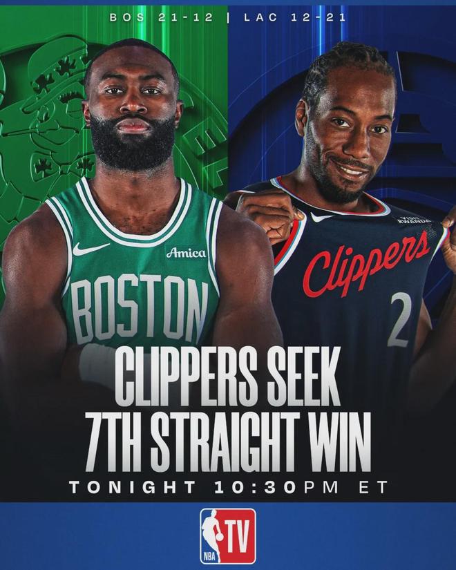 这场比赛的看点很多,伦纳德和杰伦-布朗最近状态火热。过去15场比赛,布朗场均31.6分7.1篮板5.9助攻。在快船6连胜期间,伦纳德场均39分8.5篮板2.7抢断1.5盖帽。快船本场首发:哈登、邓恩、伦纳德、科林斯、大洛佩斯。