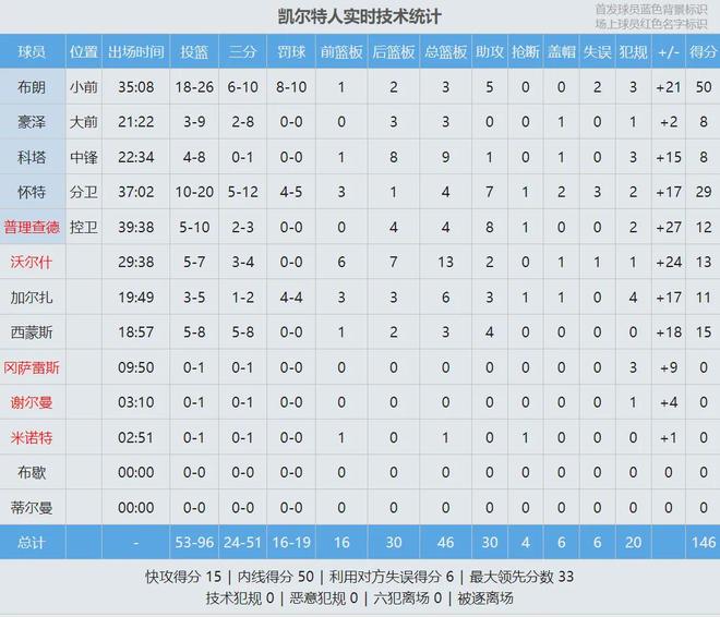 杰伦-布朗连得9分,快船落后20分以上!最后半节,泰伦卢换上纯替补阵容。布朗留在场上想拿50+,快船替补疯狂上夹击。最后4分钟,布朗拿到第50分,追平生涯得分纪录,随即下场休息。全场结束,凯尔特人146-115大胜快船!