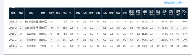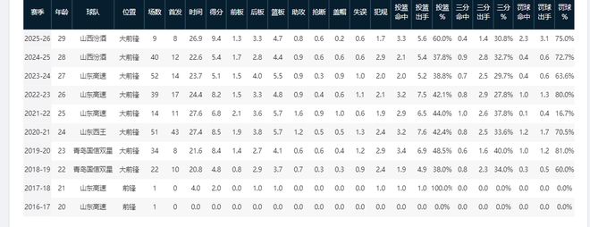 加盟山西前的一个赛季,焦海龙场均可为山东队贡献5.1分,投篮命中率38.8%。25-26赛季九轮过后,他代表山西队场均可砍9.4分4.7篮板,投篮命中率为60%,创下近八个赛季个人数据新高。