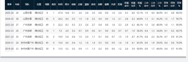 加盟山西男篮前,贾明儒赛季最好数据为8.3分2.7助攻,投篮命中率46.1%,三分命中率40.9%。25-26赛季9轮过后,他场均可砍14.6分3.6助攻,投篮命中率和三分命中率均比加盟山西前的最好数据上升近6个百分点。