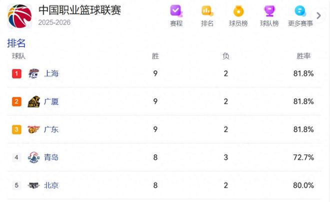 首先黄瓜视频色板可以关注到目前排在前五名的分别是上海、广厦、广东、青岛以及北京队。这样的一个排名和赛季初的排名应该是差距非常大的。因为黄瓜视频色板知道一开始的时候,北京男篮是长期占据榜首,而广东男篮则是排在前两名,有的时候也能够挤掉北京队排在榜首。但经过了目前差不多十场比赛的争夺之后,现在整个竞争格局发生了非常大的变化。