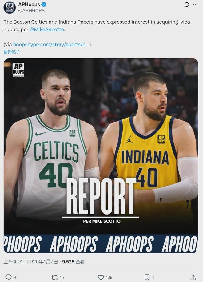北京时间1月7日,据Hoopshype记者Michael Scotto报道,快船中锋祖巴茨在交易市场上引发多支球队的强烈追求,其中包括步行者和凯尔特人。快船同意交易祖巴茨,但是快船对祖巴茨的要价高达2个首轮签,吓退了不少追求者。