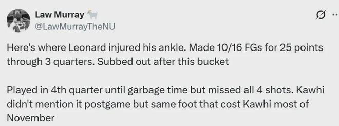最近结束的快船客场111-123不敌尼克斯,过程中伦纳德在一次跳投命中后,踩到场边的球迷导致右脚踝扭伤,本周六对阵篮网的比赛出战成疑。