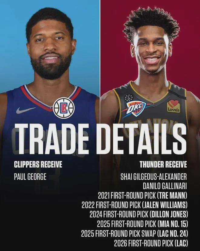2019年夏天快船为了得到乔治,送给雷霆多个未来选秀权,其中就包括2026年无保护首轮签。