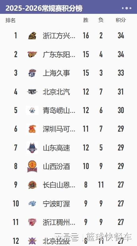 附:CBA积分榜最新排名