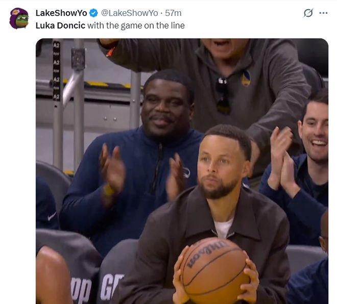 湖人媒体LakerShowYo晒出库里在场边的一段视频后嘲讽东契奇在关键时刻登场就如同场下的库里一般。