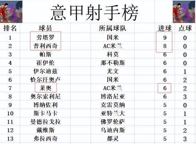 射手榜方面,劳塔罗9球继续领跑,普利西奇未能把握住机会破门,还是1球之差排在第2。莱奥打入制胜球,追上伊尔迪兹,恰尔汗奥卢和奥尔索利尼,4人6球并列第3。