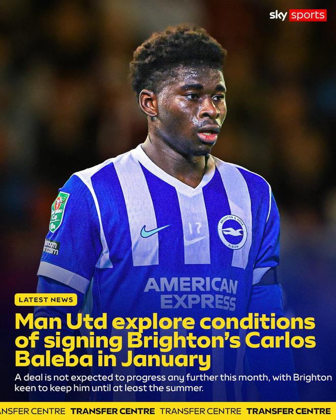 据英国天空体育报道,曼联明知1月份冬季转会窗无法得到卡洛斯·巴莱巴,却仍然再次与之进行了接洽(explored the conditions)。然而,这可能发生反效果,布莱顿将坚持1亿英镑以上的要价,否则就宁可不卖。
