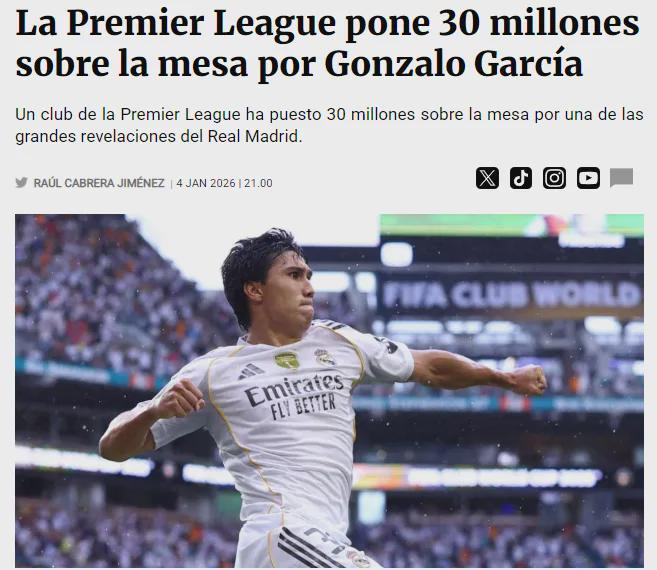北京时间1月6日,据西班牙媒体《Fichajes》报道称,阿斯顿维拉准备在冬窗支付约3000万欧元签下皇马新星贡萨洛·加西亚。鉴于上轮西甲这位年轻前锋在伯纳乌球场刚刚上演帽子戏法,皇马在是否放人方面将面临重大抉择。