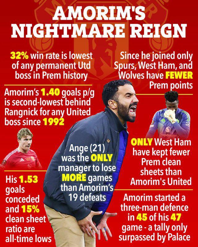 阿莫林的若干“之最”和糟糕记录: ●阿莫林32%的联赛胜率,为英超时代曼联正式主帅中最低。 ●阿莫林时代,曼联场均进1.4球,是1992年以来曼联主帅中第二低,仅优于朗尼克。 ●阿莫林带队场均丢1.53球,零封场次仅占15%,是曼联英超时代最低,同期英超只有西汉姆零封更少。 ●阿莫林时期一直踢英超的17队中,只有热刺、西汉姆、狼队的联赛积分比曼联低。他输掉19场英超,同期只有澳波(21)更多。 ●47场英超,阿莫林45场以3后卫开场,只有水晶宫这一数据更高。