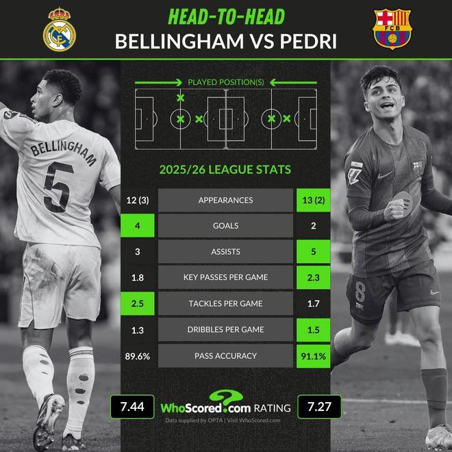 WhoScored统计贝林厄姆和佩德里本赛季至今西甲数据: